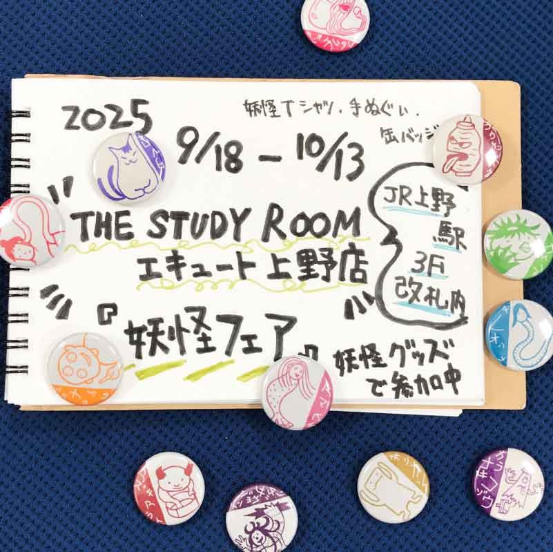 上野駅の構内(改札の中)にある、ザ・スタディールーム上野店で開催の、妖怪フェアに参加します!手ぬぐいをはじめ、新作のTシャツ、缶バッジもあります!